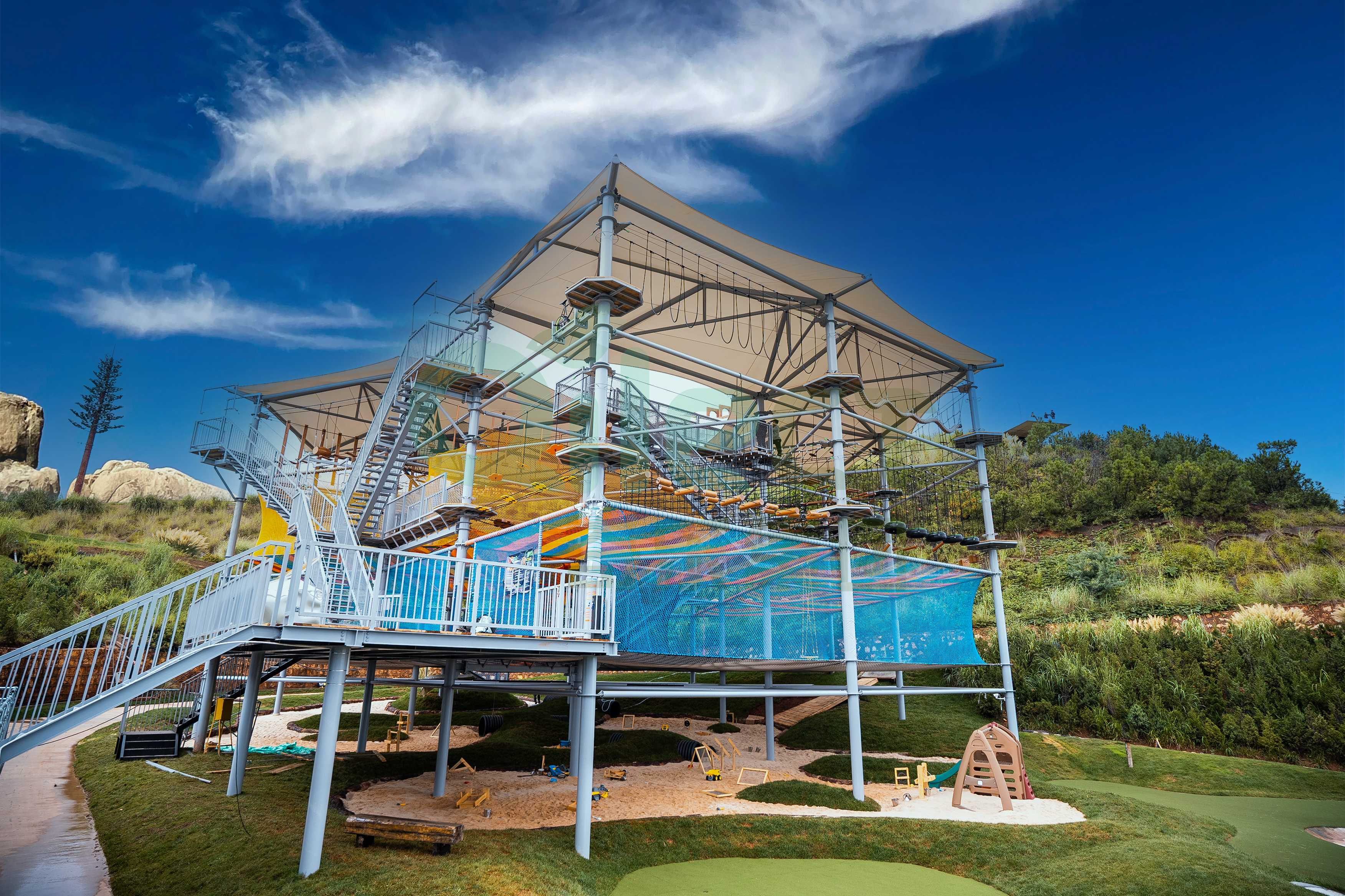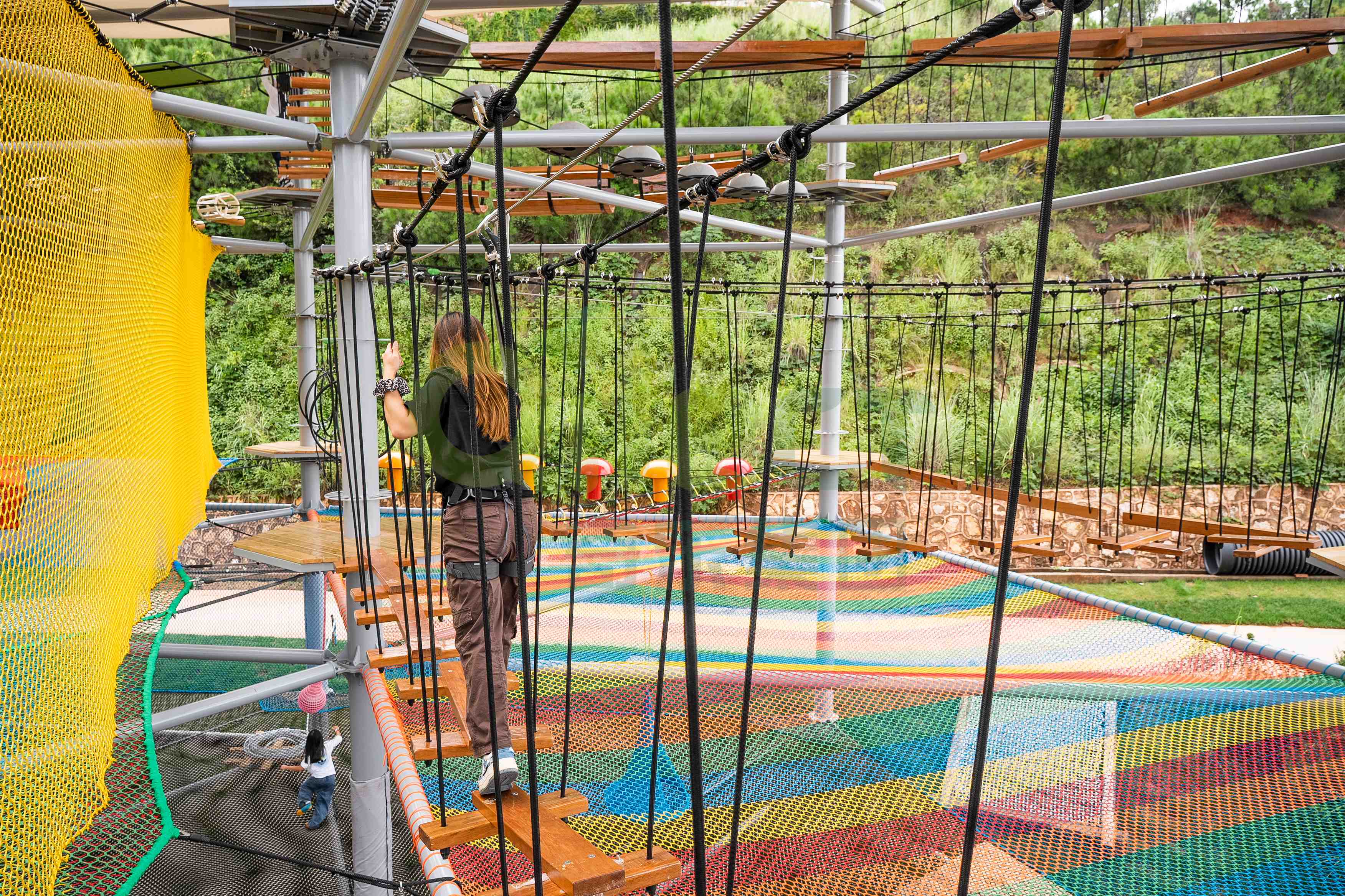 一座大型水晶塔的空中步道總長可達數百米,包含百余種趣味關卡,能夠同時容納上百名游客進行探險。更重要的是,通過科學的分層路線規劃,它能覆蓋從4歲兒童到成年人的全年齡段客群。孩子們可以在低齡區鍛煉勇氣,青少年和成人則可以挑戰更具難度的攀爬網、高空步道以及令人腎上腺素飆升的頂層速降項目。這種家庭全員可參與的特性,是其能引爆社交傳播和家庭出游市場的關鍵。
